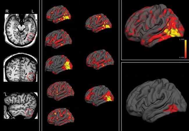 Figure 4. Images illustrating a multivariate surface-based morphometry approach for automated focal cortical dysplasia (FCD) detection. (A) 3T T1w MRI from a patient with histopathologically confirmed type I FCD in the left basal temporal area (circles). (B) Various cortical features generated from the surface-based morphometry approach, which were used as input to a nonlinear neural network classifier. The output cluster with the highest mean probability value (as yielded by the classifier) was considered the final cluster (C). Success of detection was defined by overlap between the final cluster and manual labeling (informed by noninvasive test, SEEG, postoperative MRI and histopathology) (D).