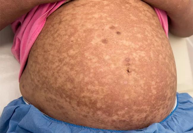 Pregnant abdomen with hypo- and hyperpigmentation indicating healing cutaneous lupus erythematosus.