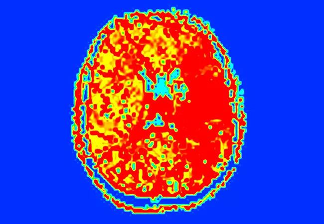 Figure 1 (left). Diffusion-weighted image showing the patient’s acute left basal ganglia and corona radiata infarct. Figure 2 (right). Perfusion image showing a deficit involving much of the left hemisphere.