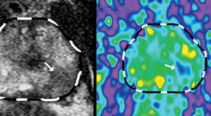 DCE allows for the visualization of blood perfusion via a bolus injection of gadolinium contrast during rapidly repeated scanning. Evidence of early and intense enhancement and washout in lesions is associated with angiogenesis seen in prostate cancers. DWI quantifies free water motion, which is restricted in lesions with increased cellularity, as is seen in prostate cancers. MRSI measures levels of choline (increased in cancer) relative to creatine and citrate peaks, and increases the specificity of low-signal intensity lesions seen on T2WI.