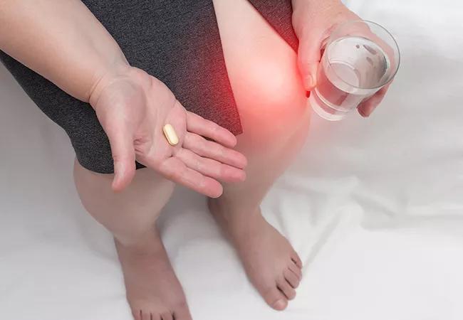A woman with a sore knee holds a chondroprotector tablet and a glass of water, glucosamine and chondroitin sulfate in her hand, copy space