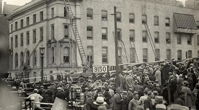 Cleveland Clinic was founded in 1921 by four doctors who wanted to establish an “ideal” medical center, where doctors from many specialties worked together as a group to provide patient care, research and education. By May 15, 1929, they had a busy practice, with an outpatient clinic and hospital in separate buildings. Deep in the basement of the hospital building, tens of thousands of volatile nitro-cellulose X-ray films were stored in rows of cabinets. For reasons that several courts of inquiry were never able to establish, the stored X-rays ignited and exploded. A cloud of poison gas rose through the busy four-story building. One hundred twenty-six people perished — including one of the founders, Dr. John Phillips.