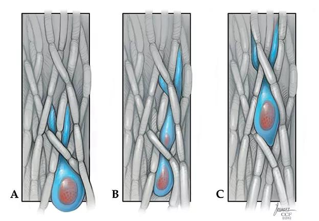 Figure. Schematic of a glioma cell (blue) migrating through brain white matter, which consists largely of oriented axons (sausage-shaped gray structures). Tumor cell migration occurs in two steps: Forward protrusion of a long finger of cell cytoplasm is followed by squeezing of the cell body, containing the cell nucleus (red), in a process that requires the molecular motor known as nonmuscle myosin II.