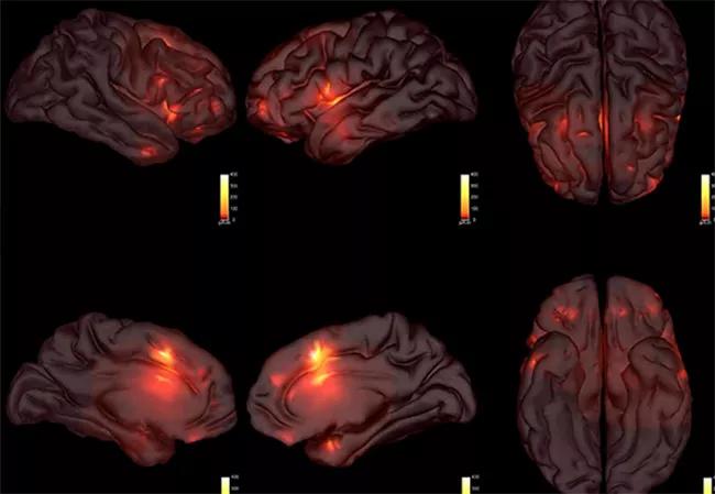 Figure. A patient’s CCEP responses are depicted as waveforms on the left with response estimates depicted by scaled colors (white is strongest) in the MRI scans on the right. Brain currents were estimated using a standard “minimum energy” constraint that restricts the currents to the vicinity of the electrodes to generate a useful estimate of brain dynamics.