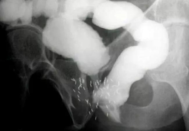 Contrast study demonstrating rectourethral fistula. Contrast outlines bladder and bowel, fistula between urethra and rectum, as well as brachytherapy seeds from prostate cancer treatment.