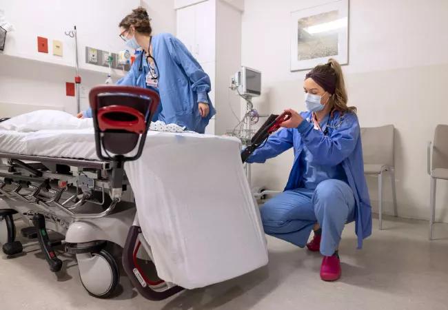 The unit’s equipment is also specialized. The beds, for example, are already outfitted with the stirrups required for a pelvic exam. This is in contrast to the general ED, where stirrups must be added to traditional hospital beds on an as-needed basis. Rooms in the OB ED are stocked with electronic fetal monitors — not standard equipment in the regular ED.