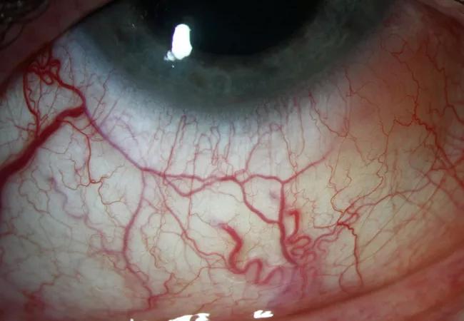 The patient’s visual acuity was 20/50 in the right eye and 20/20 in the left, while the visual field in his right eye showed progressive loss. External examination revealed no proptosis and full ocular mobility. Slit-lamp examination of the right eye revealed prominent dilation of the episcleral veins in the right eye (not the left) and faintly demarcated, slightly raised, pink subconjunctival infiltrates restricted to the superior nasal quadrants with subtle interior perilimbal extension (below).