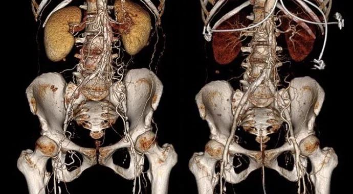 The first case involves diffuse bilateral iliac atherosclerotic plaque with occlusion of the right common femoral artery and left common and external iliac artery. The 70-year-old female patient was unable to walk due to severe leg pain.