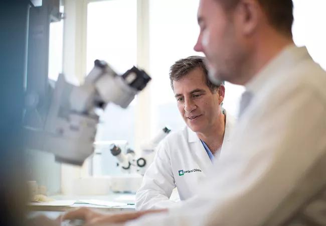 Above: A Cole Eye Institute team is at the final stages of identifying a small molecule drug to counteract the source of retinopathy of prematurity. Here, ophthalmic researchers Jonathan Sears, MD, and George Hoppe, MD, PhD, (foreground) discuss preparation of retinal specimens for analysis of the effect of hypoxia-inducible factor stabilization on retinal vascular development under hyperoxia.