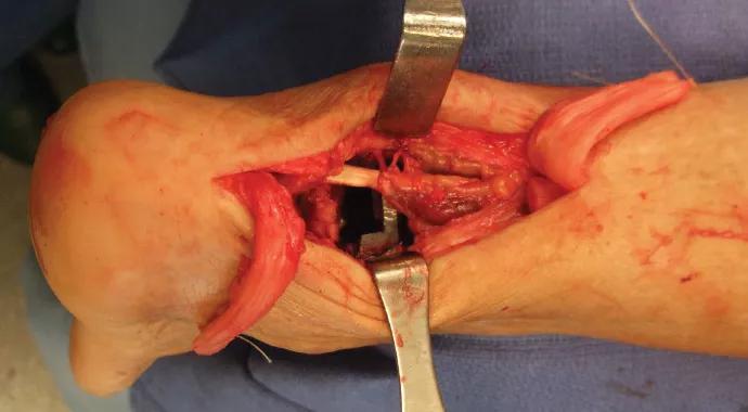 The patient is placed in the prone position and a longitudinal incision is made through the skin and down to the paratenon. The Achilles tendon can be split longitudinally and left in place, although my preference is to perform a Z cut, which allows the tendon ends to be sutured down and out of the working area (Figure 2). This also limits tension on the skin resulting from prolonged retraction. The deep posterior compartment fascia is incised, and then the flexor hallucis longus tendon is identified and retracted medially to protect the neurovascular bundle. Full exposure of the posterior tibia, ankle joint, subtalar joint and distal fibula is possible.