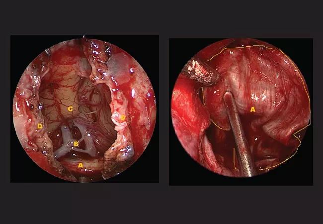 Left: Endoscopic view of the defect shows the optic chiasm (A), the anterior communicating artery (B), the frontal lobe (C) and the dural edges (D). Right: A view of the center (A) and perimeter (yellow line) of the fascia flap.