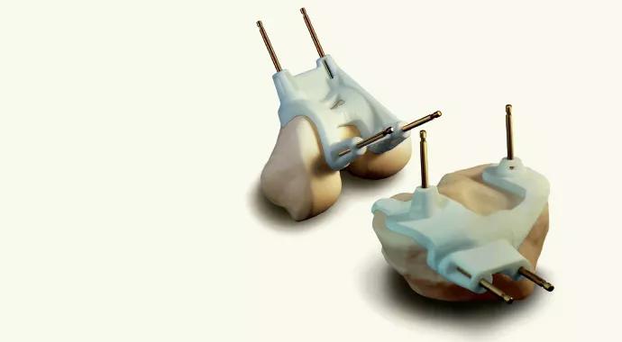 Figure. Patient-specific cutting guides pinned to models of the femur and tibia. Reprinted with permission from Zimmer.