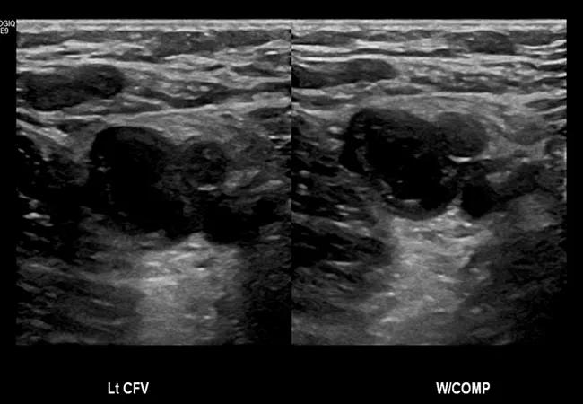 Figure. Ultrasound showing a thrombus in the left common femoral vein that is inhibiting compression of the vein.
