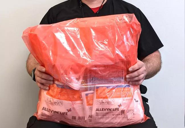 The proning kits are a hit with nurses. “They take them off the shelf and have everything they need, so they don’t have to look around for any supplies,” says Moore. “Once you break the seal on the bag, there’s no way to close it again. The bag is ruined, so nurses can tell if something has been taken out.” The bagged kits also require less storage space.