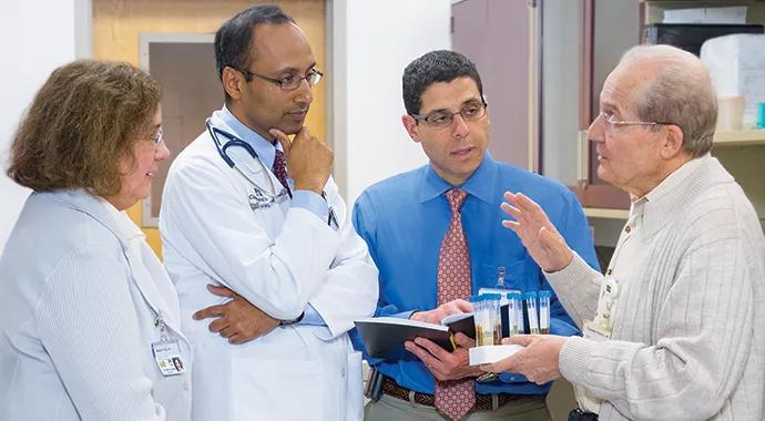 Top photo: The collaborative team that’s leading the Cleveland Clinic pediatric IBD study. From left to right: pediatric gastroenterologists Marsha Kay, MD, and Rishi Gupta, MD, along with adult-care gastroenterologists Jean-Paul Achkar, MD, and Claudio Fiocchi, MD of the Digestive Disease Institute and Lerner Research Institute.