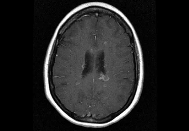 And the findings suggest that fingolimod may hold a few advantages — namely, that patients are less likely to discontinue medication early in the course of treatment and are at lower risk for enhancing MS lesions on brain MRI (Figure) as compared with patients taking DMF. Results also showed that DMF-treated patients tended to relapse earlier compared with fingolimod-treated patients.
