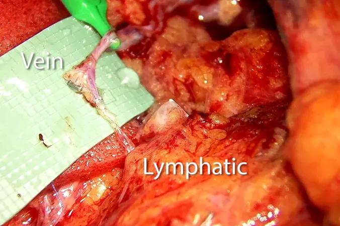 During the second step of the procedure, the plastic surgeon performs lymphaticovenous bypass, a microsurgical technique in which the severed lymphatic channels are connected to nearby veins. This reroutes lymphatic fluid, potentially preventing the buildup that leads to lymphedema.