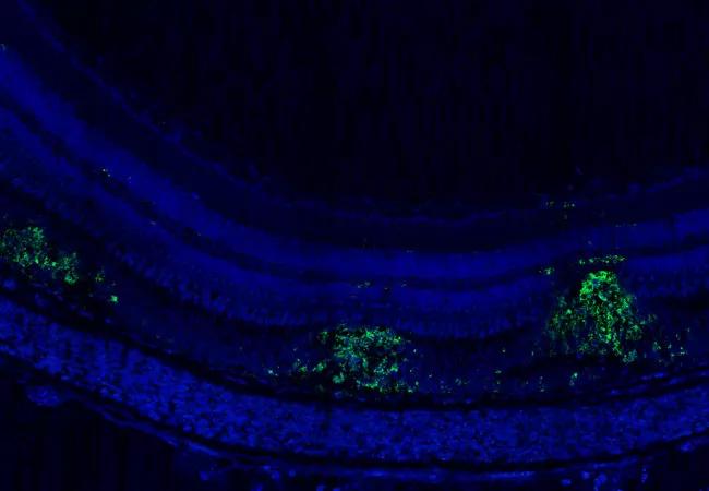 Proliferating stem cells (red) shown with nuclei (blue) from the different layers of the retina
