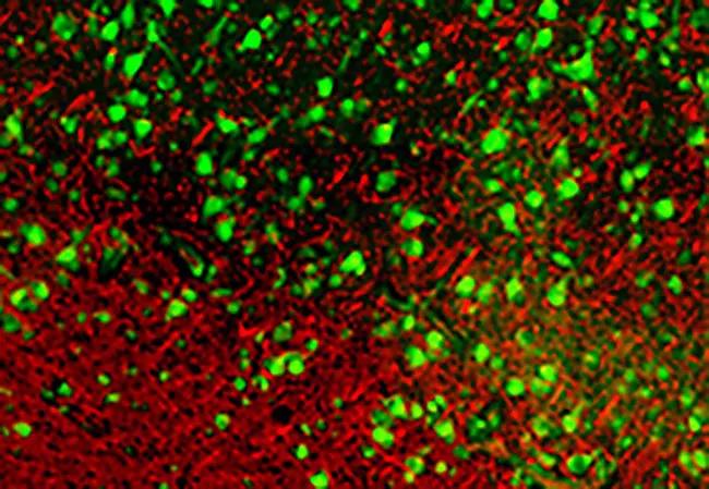 Figure. (Top left) Myelin immunostaining identifies a typical subpial MS lesion (loss of brown color) that extends from the surface of the brain to the deeper layers. These lesions, extensive in progressive MS brains, contribute to progressive neurologic disability. (Bottom left) Oligodendrocytes (myelin-making cells) and neurons present in the regions of nonlesioned gray matter (NLGM; normal myelin) and lesioned gray matter (LGM) will be compared to identify genes and other regulatory factors related to failure in remyelination and loss of neuronal function in progressive MS. (Right) Small regulatory RNAs that control gene expression are detected in cortical neurons in progressive MS brains (green cells; red is myelin).