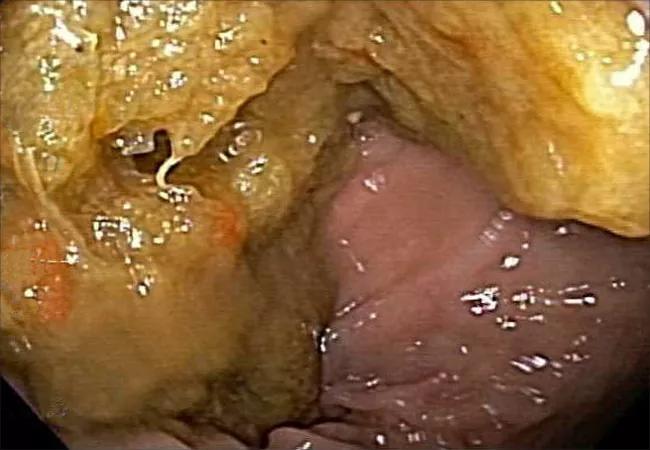 Image left depicts a dirty colon while image right depicts a clean colon.