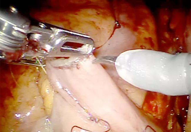 Successful execution of this complex procedure requires an experienced surgical team, including a bedside surgical assistant skilled in laparoscopic technique, stapler mechanics and functionality, handling of the guide wire and ureteral stents, and using the instruments to improve the console surgeon’s visualization.