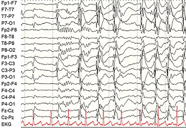 Sleep EEG (image below) was reported as electrical status epilepticus during sleep (ESES) and showed high-amplitude spiking occurring in 80 percent of slow-wave sleep in the left language-dominant hemisphere in the posterior temporoparietal region.