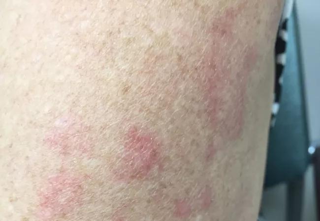 A 69-year-old woman presented to Cleveland Clinic’s Lupus Clinic with a diagnosis of subacute cutaneous lupus erythematosus (SCLE). She had initially presented to an outside physician with red, blotchy, pruritic skin lesions on her chest that were spreading but not overly distressing. Her initial treatment was a topical preparation of unknown composition, but her skin did not improve.
