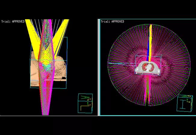 Above image is a ‘rooms-eye view’ of modern VMAT (volumetric arc therapy) utilized for reirradiation showing the arrangement of 5 arcs.