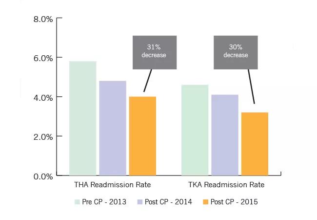 Implementing care paths helped us realize substantial savings and improvement in quality metrics like readmissions. The total two-year cost saving impact of using care paths for total hip arthroplasty (THA) and total knee arthroplasty (TKA) was $1.65 million. Readmissions declined steadily, both for TKA and THA. For THA, readmissions dropped from 5.8 percent to 4.8 percent in 2014, and to 4.0 percent by 2015, representing a 31 percent decrease in readmissions overall.
