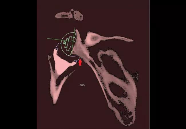 Figure 2 Evidence of scapular notching along the posteroinferior scapular neck, observed on a postoperative CT scan and shown by the red arrow, with the notched scapula outlined in yellow.