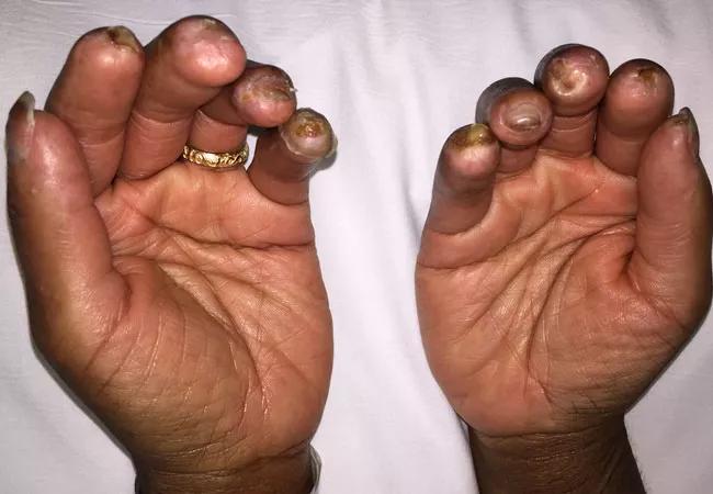 On examination, there was evidence of auto‐amputation of some of her distal phalanges and ulceration of the overlying skin.