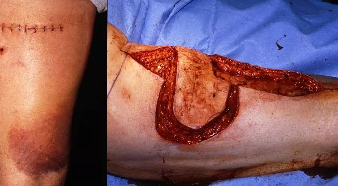 Figure. Photos from a case illustrating the consequences of incomplete excision. Left panel: A middle-aged man presented to clinic following excision of a “benign lipoma” at an outside institution. The excision was done through a 10-cm transverse incision over the posterolateral aspect of the left thigh, with a drain placed 3 cm distal to the incision. No preoperative imaging was obtained. Pathology was consistent with a high-grade soft tissue sarcoma. Right panel: In the OR, the incision was marked out to provide no less than 2 cm of skin surrounding the incision, as carefully correlated with a preoperative MRI. The wound ultimately required split-thickness skin graft coverage to achieve closure.