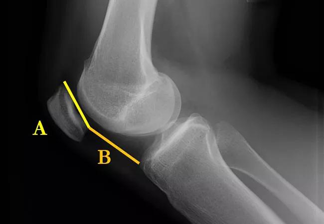 Figure 1. Caton-Deschamps index. The distance from the inferior articular surface to the anterosuperior corner of the tibia (B) is measured by length of the patellar articular surface (A).