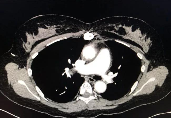 The possibility that pulmonary artery involvement in TAK was the cause of this patient’s imaging findings was investigated. After receiving premedication prophylaxis, she safely underwent a CTA. This study was negative for pulmonary embolism and showed stenosis and wall thickening of the main left pulmonary artery with reduced blood flow corresponding to the abnormal perfusion scan. Using computerized visualization techniques, it was possible to determine that the pulmonary artery stenosis had been present at the time of the original diagnosis for which she had been treated.