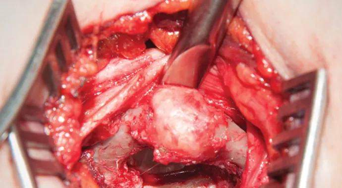The anterior scalene is partially resected, allowing visualization of the subclavian artery, which can be mobilized to improve exposure of the rib. The brachial plexus will be seen lateral to the artery and should be dissected from the surrounding tissue. The first rib will lie underneath these structures and can be manually palpated. The cervical rib lies more superiorly, and with retraction of structures, it can be cleared circumferentially from its posterior attachment (Figure 1). The rib or ribs are then removed en bloc (Figures 2 and 3).