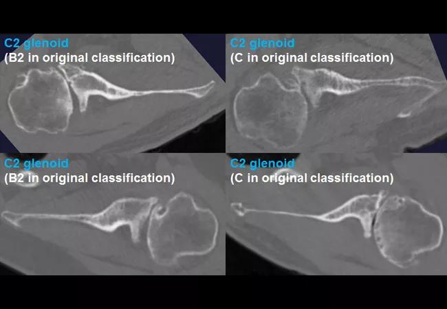 Figure 3: The C2 glenoid is similar to the B2 glenoid in that there is a biconcave surface with associated posterior humeral head subluxation; however, the pathologic glenoid retroversion and the premorbid glenoid version are both greater in the C2 compared with the B2 glenoid. Shown are 4 examples of C2 glenoids, with the classification according to the original Walch classification system also noted.