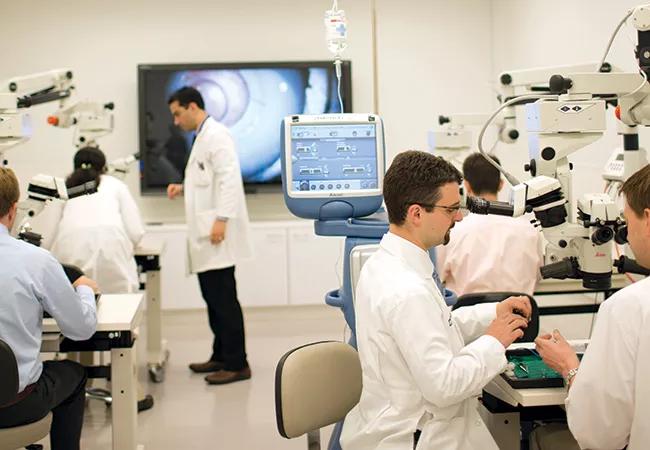 Weekly surgical training laboratory sessions also begin in the first year. Our training simulation laboratory has advanced workstations, including operating room-grade microscopes, phaco units and the Eyesi surgical simulator, the most realistic virtual reality ophthalmic surgery training device. On any given day, as many as four staff instructors are present.