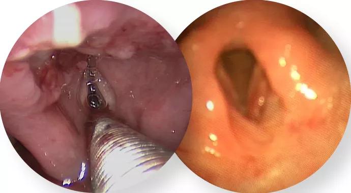 She was thus clinically staged as a cT2N2CMO, stage 4 supraglottic laryngeal cancer patient. After discussion at the multidisciplinary tumor board and independent, pretreatment evaluation by the head and neck radiation oncology and medical oncology services, the patient elected to undergo a transoral robotic supraglottic laryngectomy (Figure 2) and bilateral neck dissections instead of radiation or chemoradiation options for nonsurgical management.