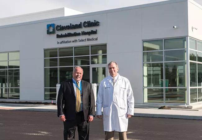The photo above shows two leaders of the Beachwood facility — Cleveland Clinic Rehabilitation Hospital, Beachwood — outside the new building. On the left is the facility’s Chief Executive Office/Market Executive, Dave Richer, and on the right is its Medical Director, Patrick Shaughnessy, MD.