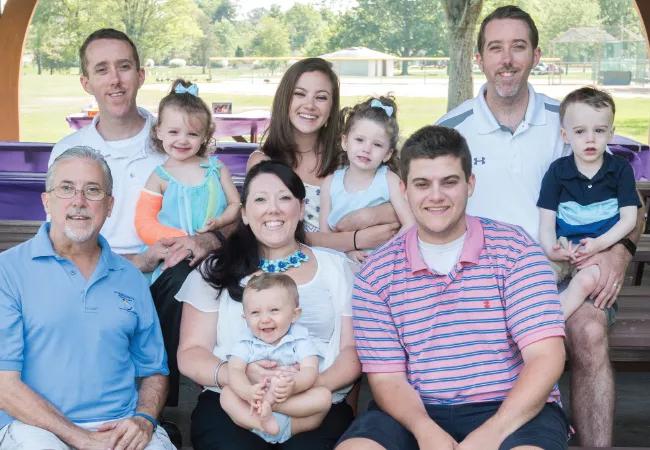 Ten of the 13 members of the extended Wagner family who have osteogenesis imperfecta. Bottom row, left to right: Mark Wagner, Moira Johnston, Declan Johnston (in Moira’s lap), Brendan Wagner. Top row, left to right: Kevin Wagner, MacKenzie Wagner (note the orange cast on her arm), Elizabeth Wagner, Makayla Johnston, Ryan Wagner, Mason Wagner. The three other affected living family members not depicted here are David Wagner Sr. (60+ broken bones to date), David Wagner Jr. (30+ broken bones) and Danielle Wagner (30+ broken bones).