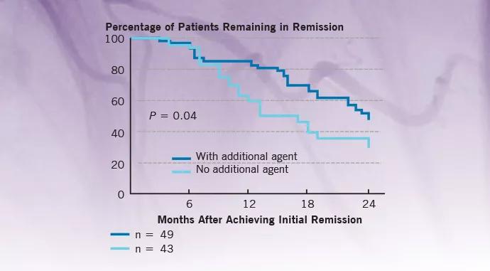 In all, 110 patients (median age, 50 years; 51 percent women) were included (Figure 1). In 91 percent, the indication for the first RTX infusion was relapsing or persistent disease. Median follow-up was 23 months (interquartile range [IQR], 10-50). Complete remission was achieved in 97 percent of patients. Relapses occurred in 47 percent, and the median time to relapse was 13 months (IQR, 7-20.5). Within a subset of 16 patients who were relapse-free at two years after one RTX course, remissions endured for two to six years in eight patients. Relapse-free survival was significantly higher in patients receiving a conventional maintenance agent (azathioprine [AZA], methotrexate [MTX] or, if AZA or MTX were not tolerated, mycophenolate mofetil [MMF]) in conjunction with RTX and glucocorticoids (n = 49) than in those not receiving a maintenance agent (n = 43) (P = .04) (Figure 2). The hazard ratio for relapse was 0.54 (95% confidence interval, 0.30-0.99) in those receiving a second agent for remission maintenance. Serious adverse events did not differ between the two groups.