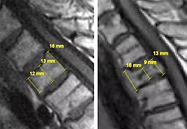 Both Spine Journal papers stem from a retrospective analysis of consecutive patients at Cleveland Clinic who had both multiple myeloma and an associated pathologic vertebral fracture from 2007 through 2013. Anterior, middle and posterior vertebral body heights were measured from midline sagittal T1-weighted MRIs at baseline and each follow-up visit through the end of follow-up (mean of 40 months) or until surgical spine intervention or death. Fractures were characterized by Genant grade and morphology (see Figure).