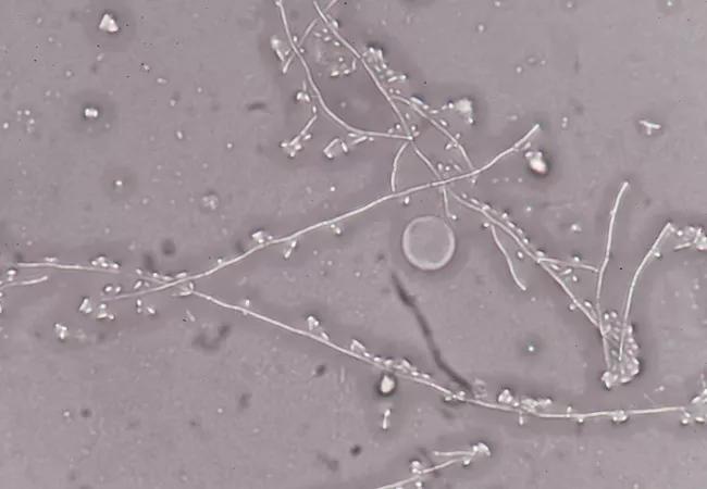 Saline microscopy (Figure 2) with the addition of 10 percent KOH may reveal the characteristic fungal elements, but its sensitivity is only 50 percent.